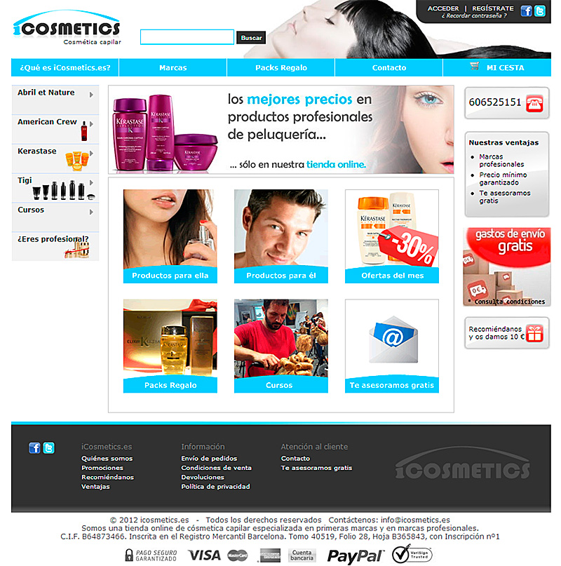 Botiga virtual de l’empresa Icosmetics dedicada als articles de cosmètica. Disseny i programació a mida. Inclou gestor de continguts, clients, enviaments, descomptes, pagaments, etc.
